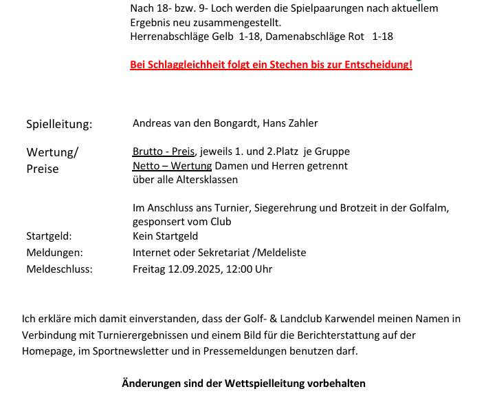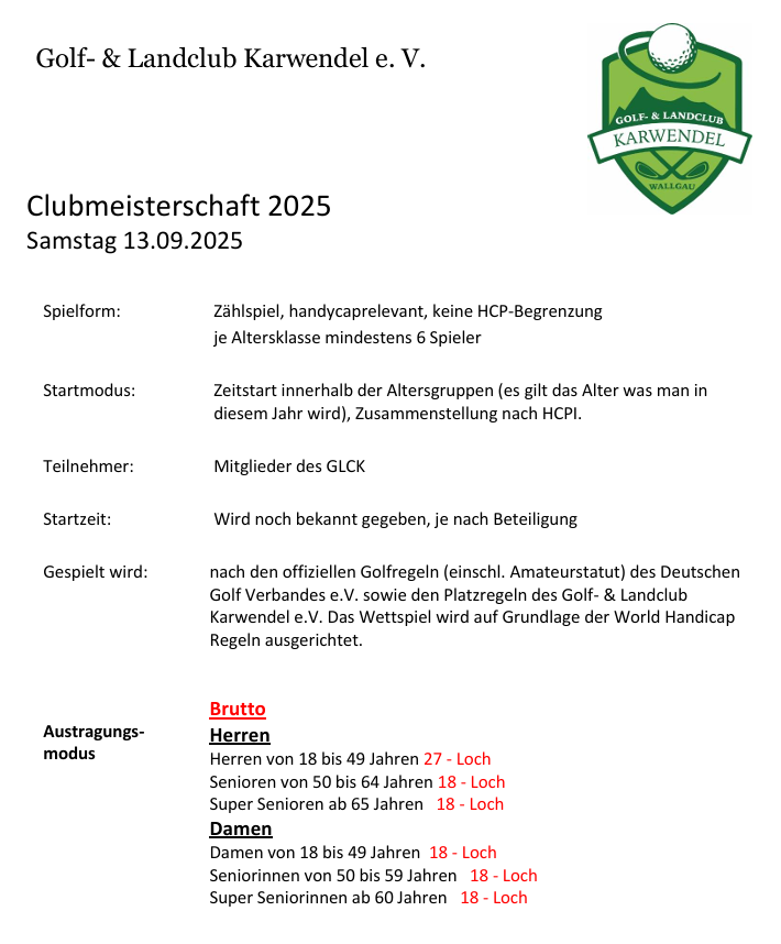 Unsere Clubmeisterschaft 2025 findet am Samstag 13.09.2025 statt, alle Altersklassen spielen 18-Loch, nur die Herren spielen 27-Loch. Eine Clubmeisterschaft ist der Höhepunkt eines jeden Vereins, wir freuen uns auf sehr viele Spieler...